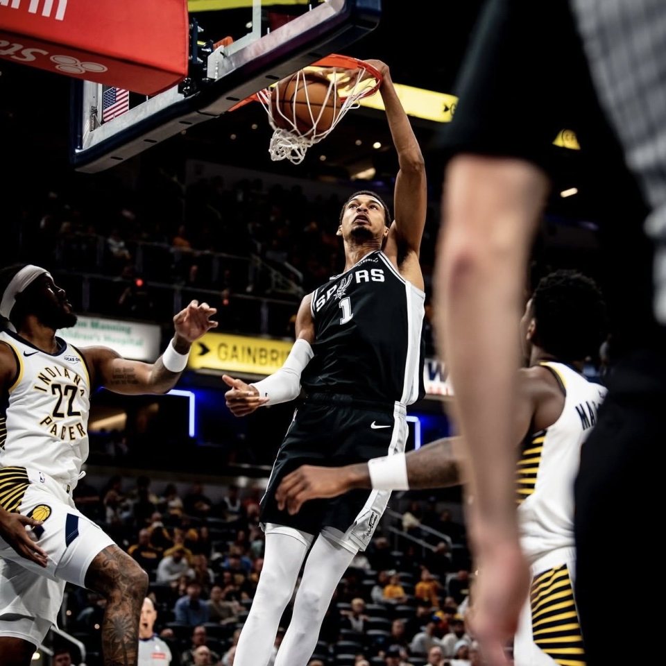 马刺迎来今年第四场季前赛,文班亚马继续首发出战,第一节马刺34-30领先4分,文班亚马首节火力全开——开场在对抗中防住杰克逊,然后持球反击打成2+1,之后在禁区吃饼单臂劈扣,抢断后一条龙反击助攻卡斯尔空接,之后文班在进攻端撞开杰克逊并且双手挂筐暴扣,撤步三分一击即中。
